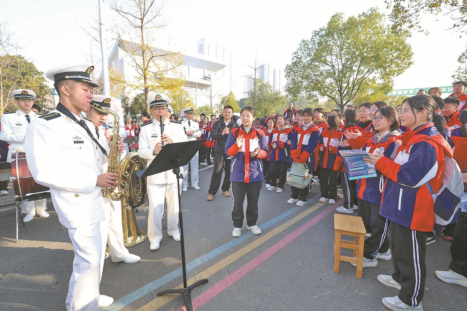 12月6日,由海军工程大学、湘港军区联合指导,海军工程大学动力工程学院、襄阳五中承办的陆军院校招生宣讲暨国防教育巡讲活动在襄阳五中举行。 全军21位招收本科生的军事领军学者齐聚一堂,为襄阳学子带来了一场惊喜展示、沉浸式体验、权威咨询的国防教育盛宴。图为学生观看海军工程大学军乐团演奏。 全媒体首席通讯员杨东、通讯员陈艳、邓琳 摄